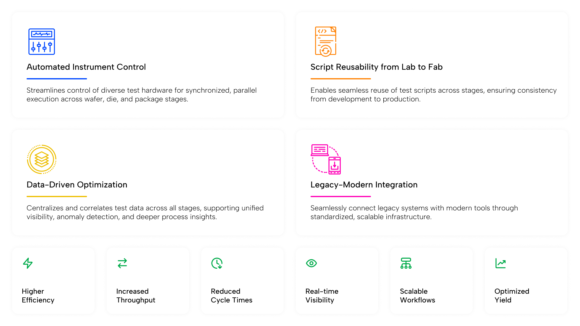 To bridge these disparities, semiconductor manufacturing requires more than just automation at the hardware level. It requires a comprehensive software infrastructure that ties everything together by standardizing test execution, centralizing control, enabling data-driven insights, and unifying operations across all stages of testing.