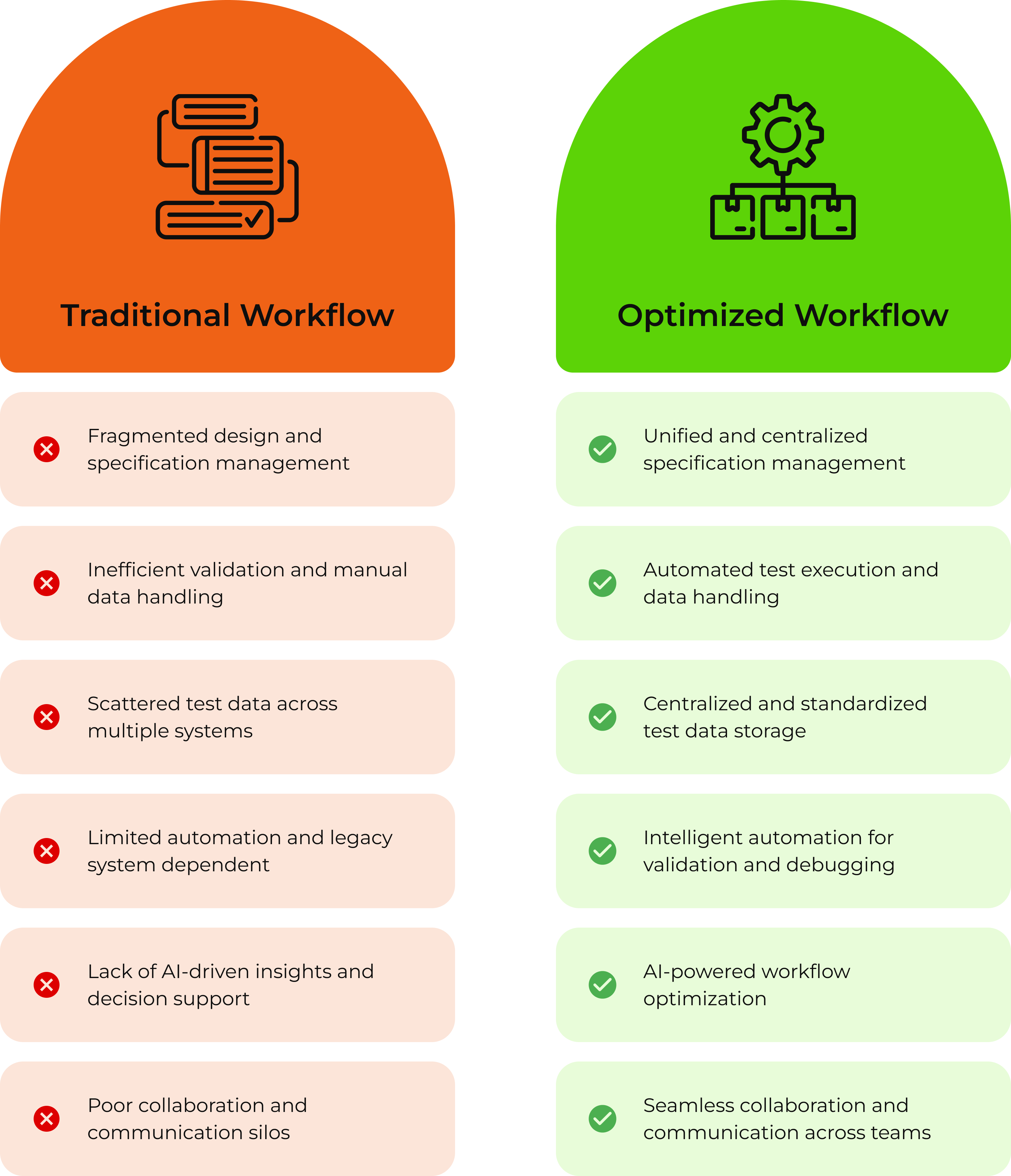 • Semiconductor workflows lack unified and centralized tools for handling specifications across design, validation, and testing, resulting in inconsistencies and inefficiencies.